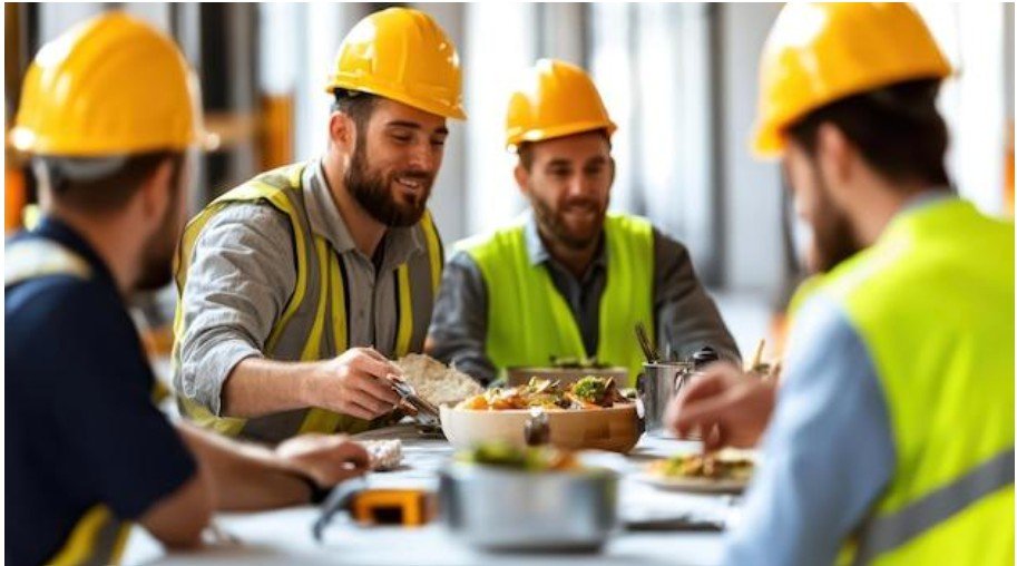 Un groupe d'ouvriers partageant des anecdotes autour d'une table pour un repas chaud à l'heure du déjeuner sur un chantier de construction