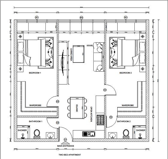 L'appartement deux chambres est la plus grande version de l'appartement MODUVERSAL ; il peut accueillir confortablement 5 à 6 personnes.